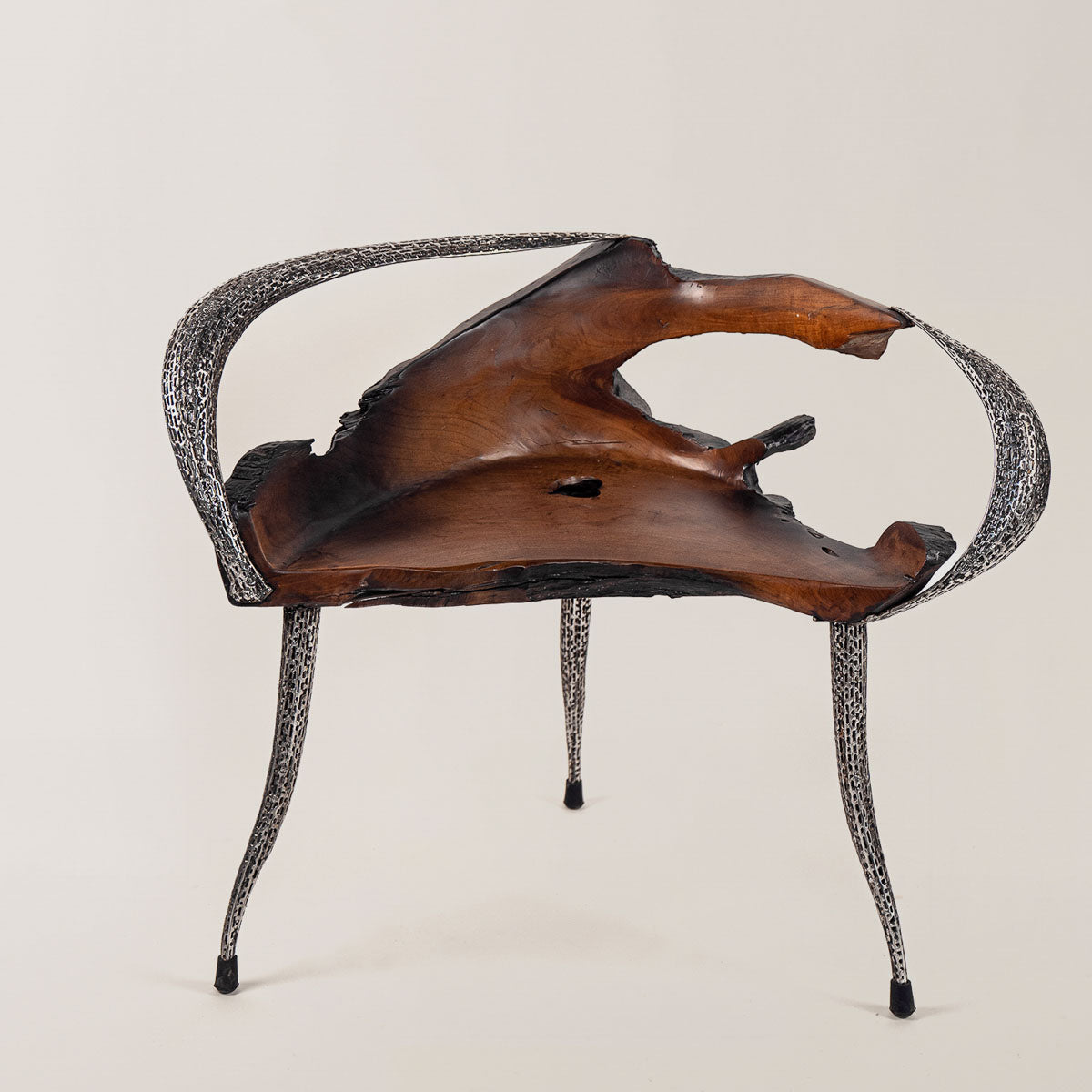 In Indonesien von erfahrenen Kunsthandwerkern handgefertigt, kombiniert der Sessel traditionelle Fertigungstechniken mit modernen Innovationen. Die filigranen Edelstahleinlagen werden präzise verschweißt, um eine Verbindung aus optischer Leichtigkeit und robuster Festigkeit zu schaffen.