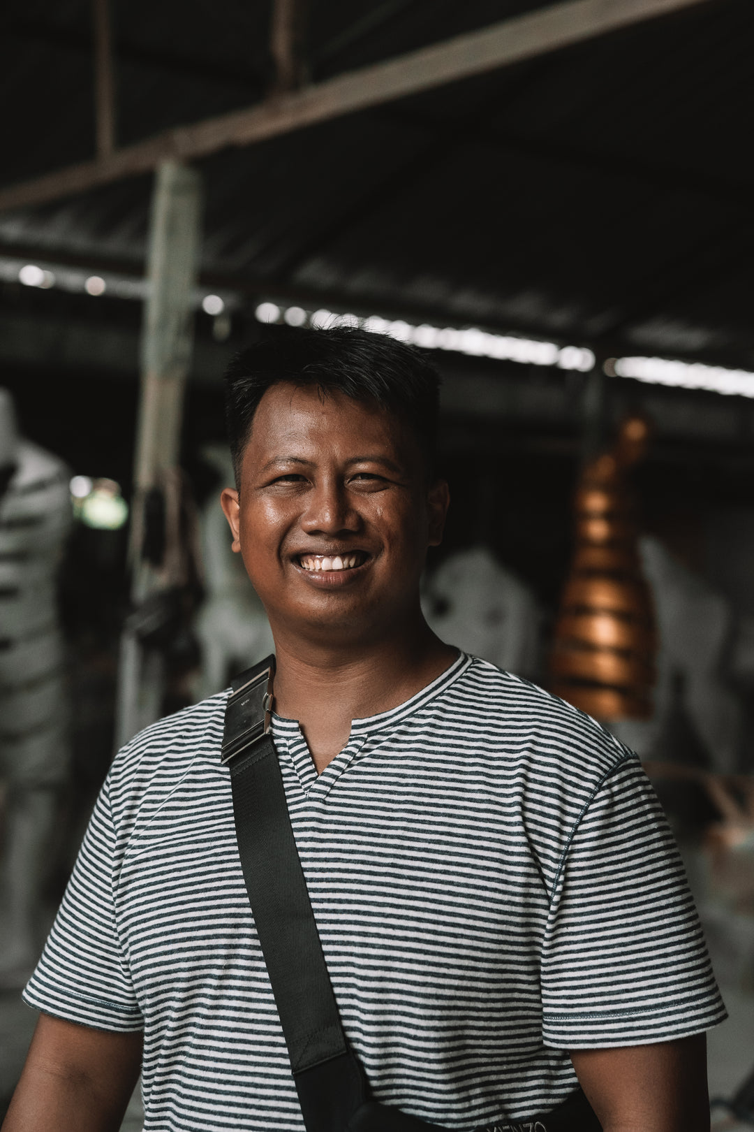 Tirta, unser einheimischer Mitarbeiter vor Ort, spielt eine entscheidende Rolle in unserem Prozess. Seine scharfen Augen überwachen jede Phase der Produktion, um sicherzustellen, dass jedes Kunstwerk unseren hohen Standards entspricht. Dieses Engagement für Qualität gewährleistet, dass INDOO-Produkte nicht nur schön, sondern auch von unübertroffener Qualität sind.
